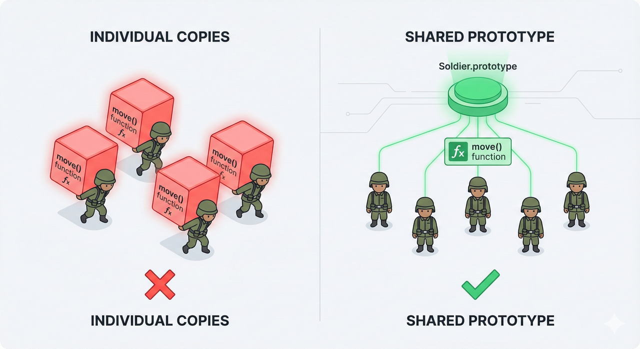 To see why this "fallback" is so important in the real world, let’s look at a classic problem. Imagine you are building a game with 1,000 "Soldier" objects. Each soldier needs a move() function. If you define the function inside the constructor, like this: