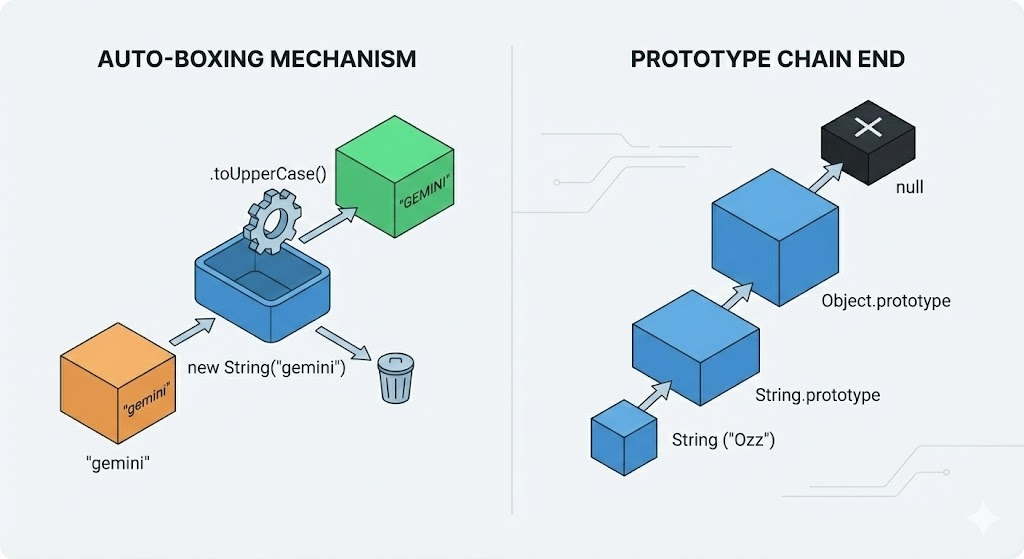 The moment you try to access a property or method on a primitive (like .toUpperCase()), JavaScript performs a magic trick called Boxing: